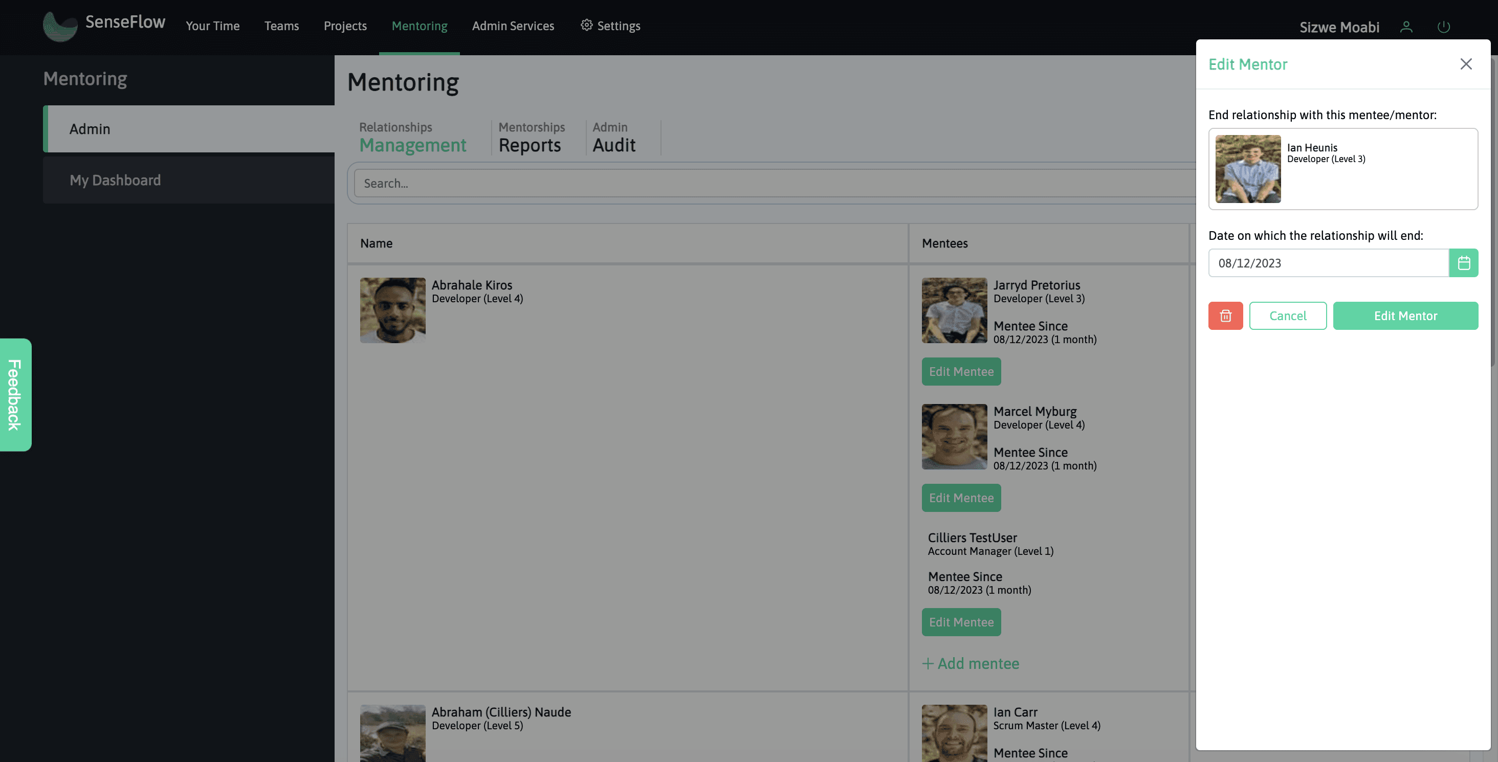 Lastly, part of mentoring on SenseFlow included having an admin view for the Business Support team to see which mentorship pairings are visible, have ended or have been cancelled. This part of mentoring was useful to see who can be paired or who already has a mentor/ mentee.